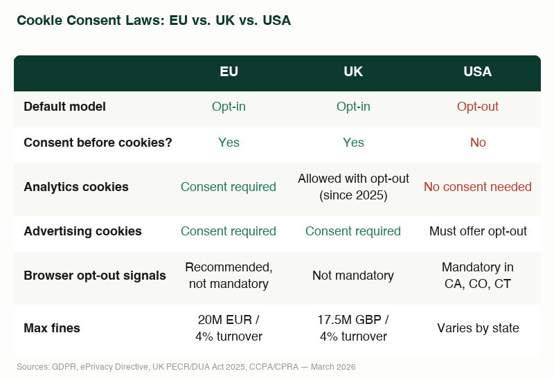 The practical difference is significant. A website that’s perfectly legal in the US might be in clear violation in the EU.