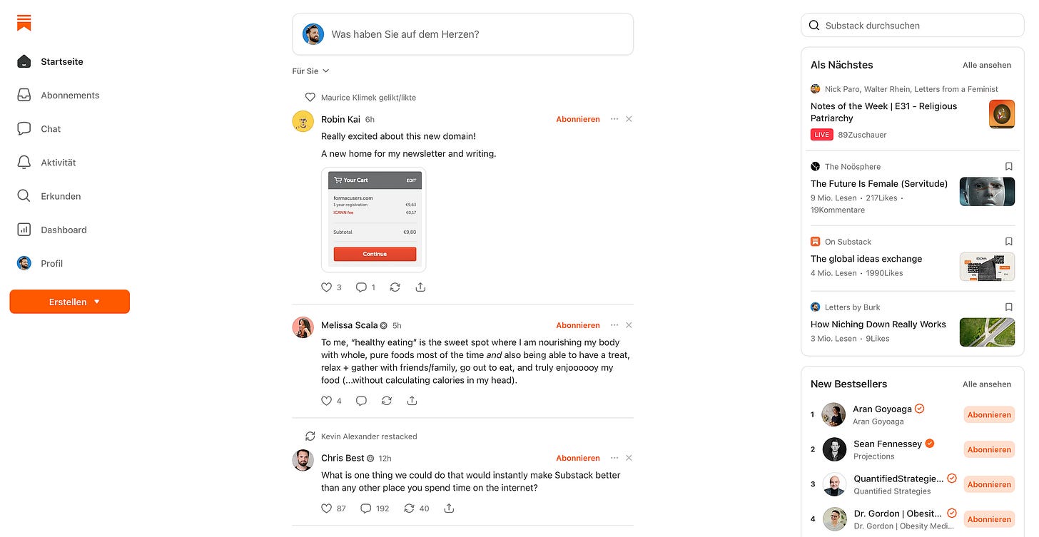 Notes is Substack’s social feed. Short posts, restacks, replies.