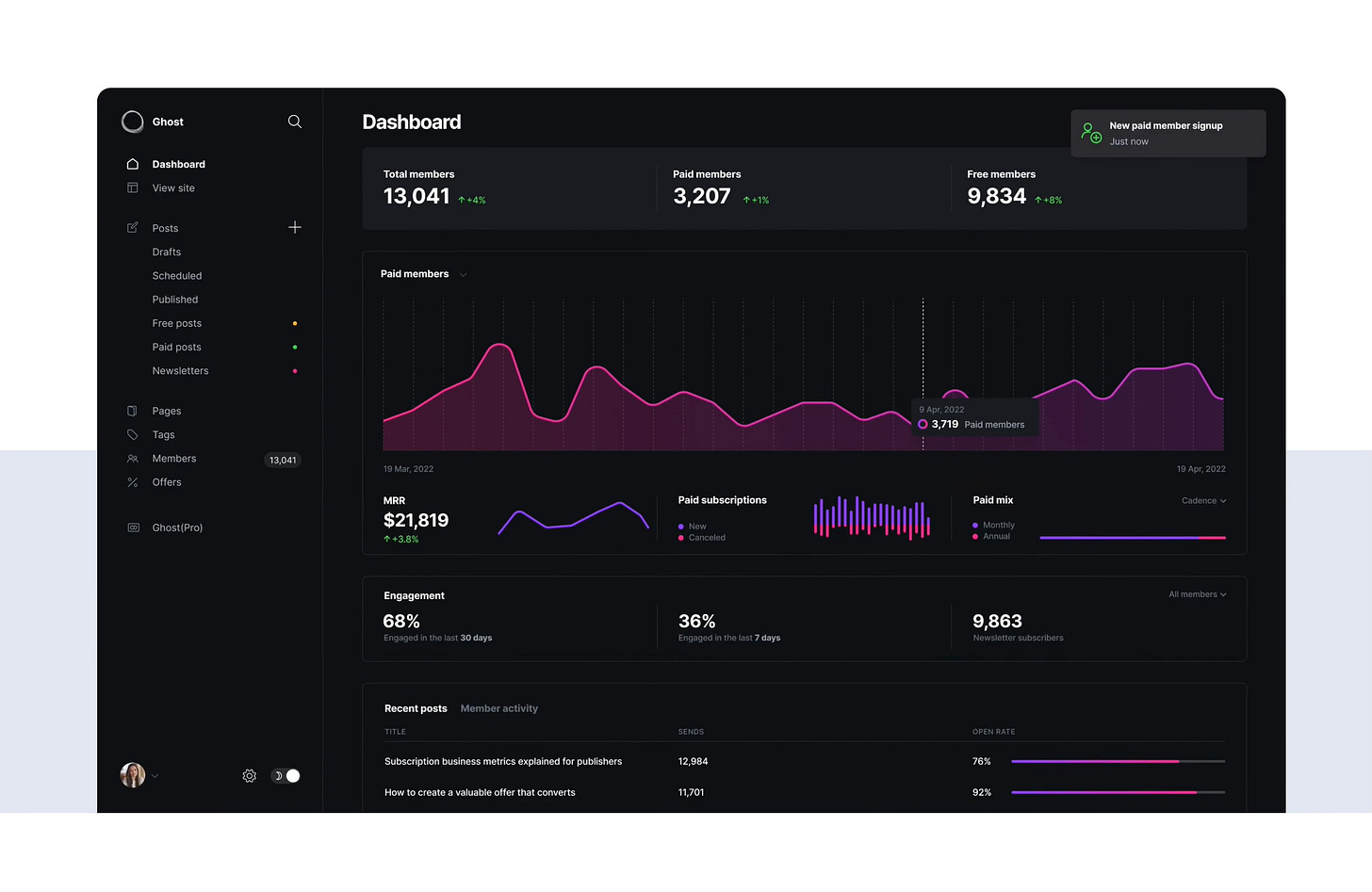 Monetizing your work is easy with Ghost Pro plans. You can accept recurring payments from subscribers who pay for exclusive access and content. Integrations with Stripe also allow you to instantly activate paid subscriptions.