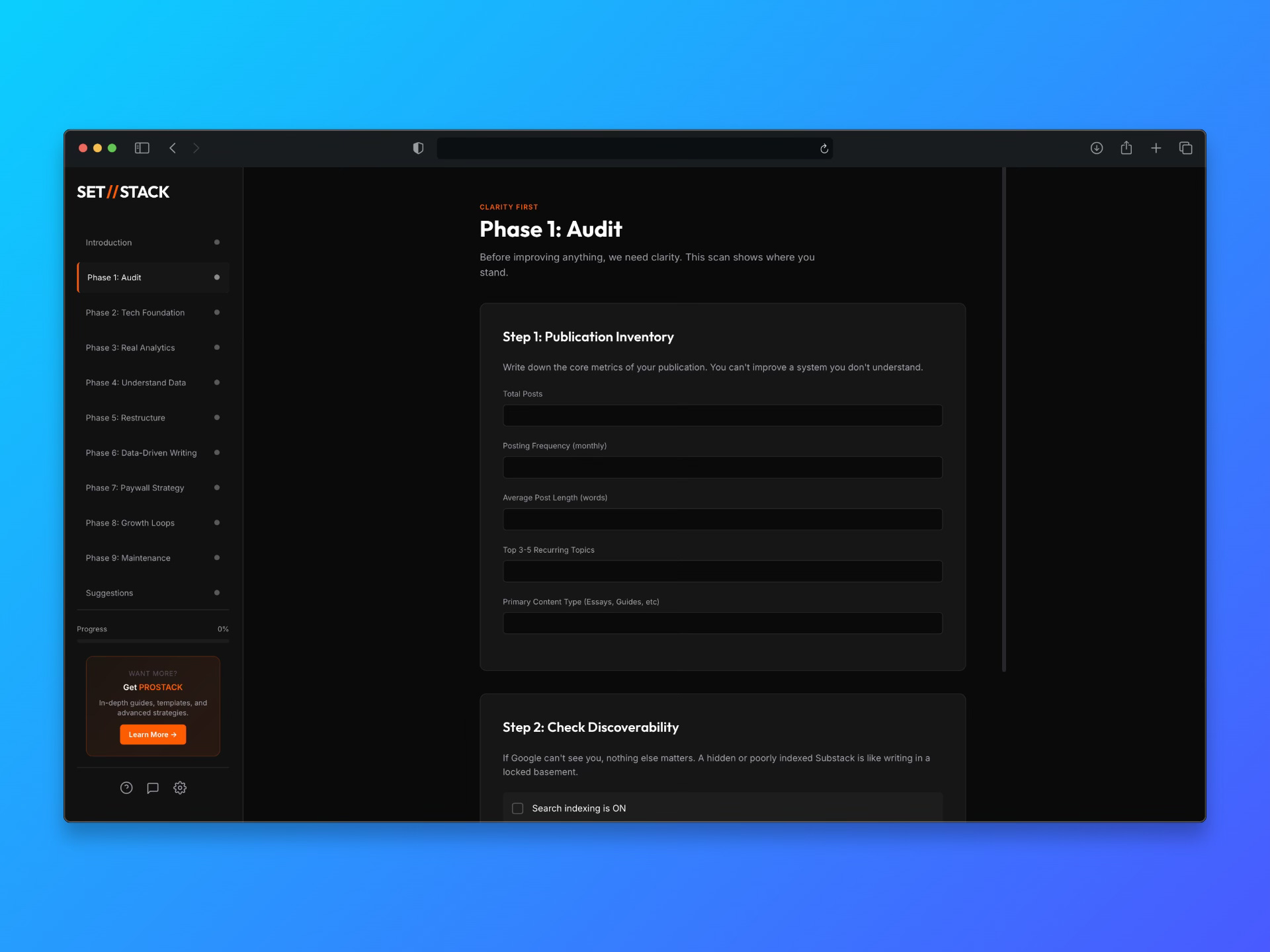Setstack is a free tool, you can use without a login or account. It will give you an audit and a structure for your Substack publication.