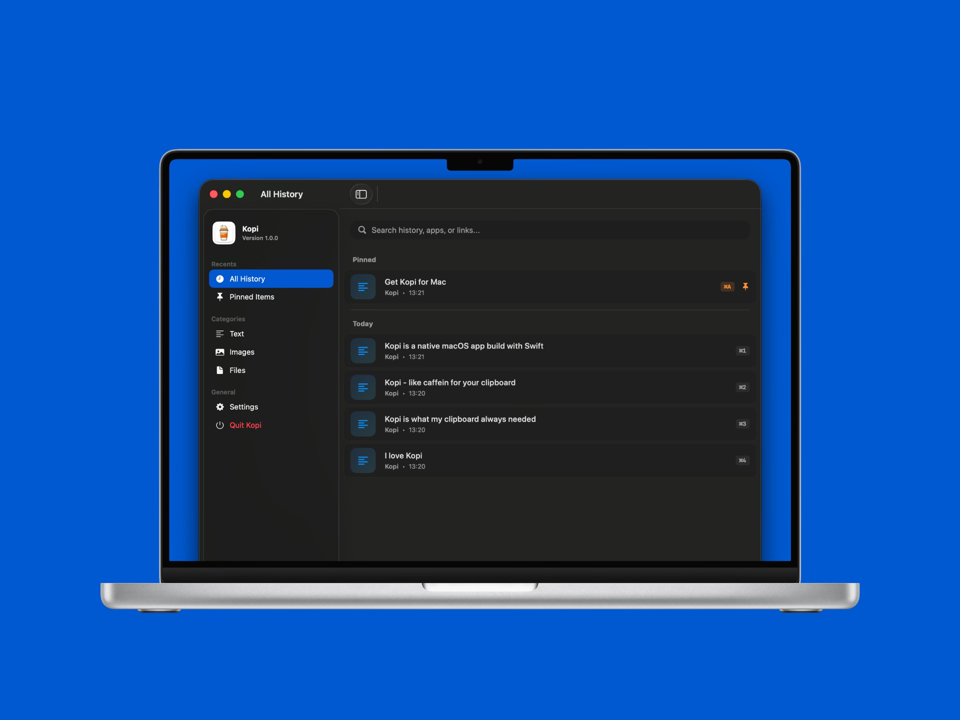 Keyboard First Design: Kopi is for those who prefer their fingers on the keyboard. Access the app, navigate your history, search, and paste—all without ever reaching for your mouse or trackpad.
